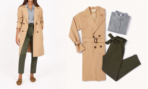 Do you prefer a clean and fluid silhouette over prints. pair your trench coat with a clean striped shirt and trousers with a bow in khaki tones. You’ll be elegant and a minimal look.